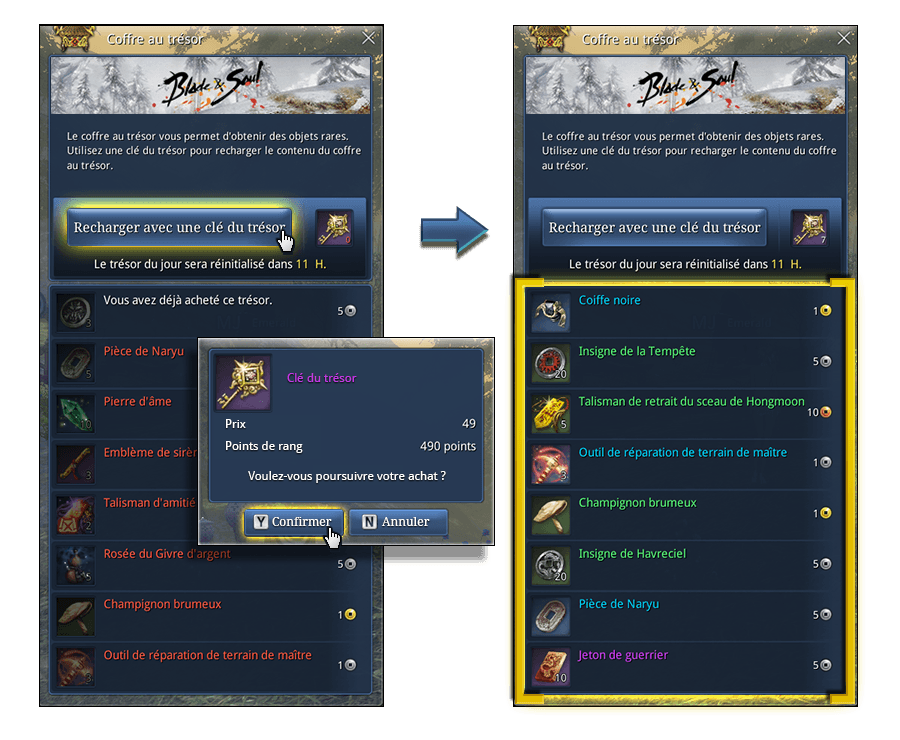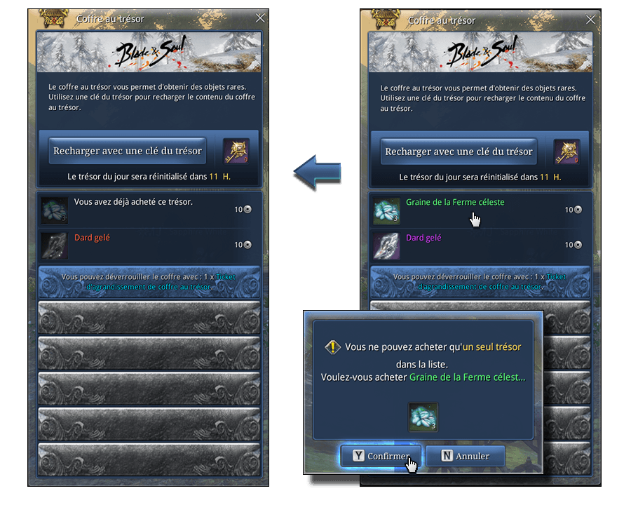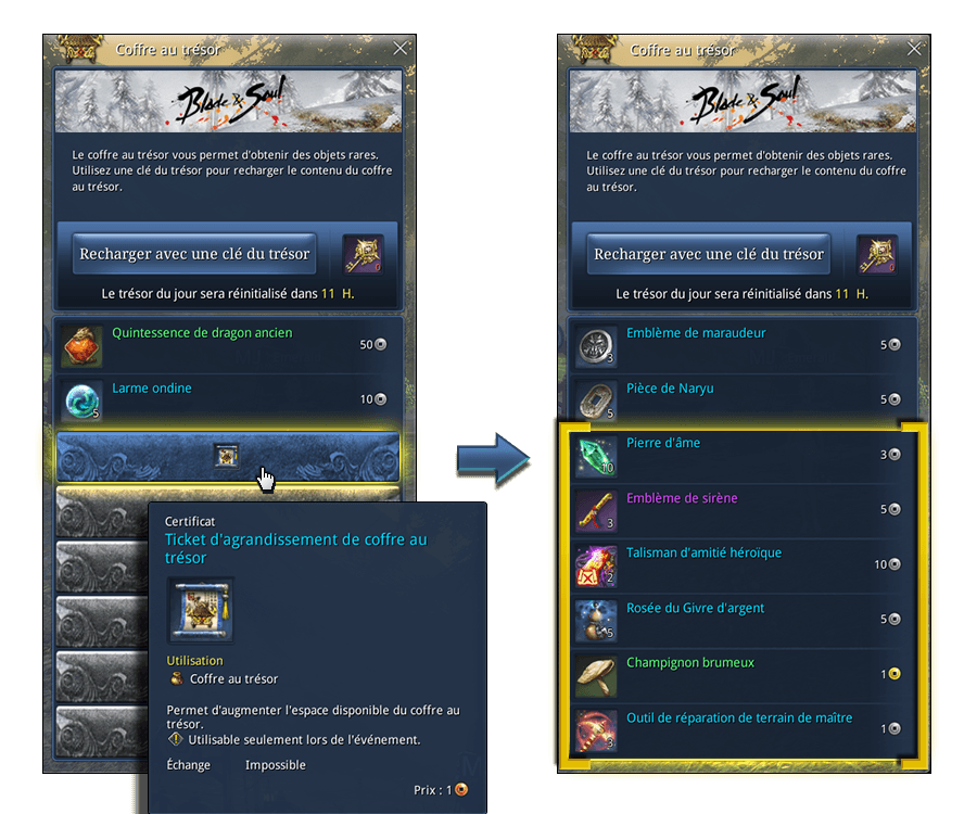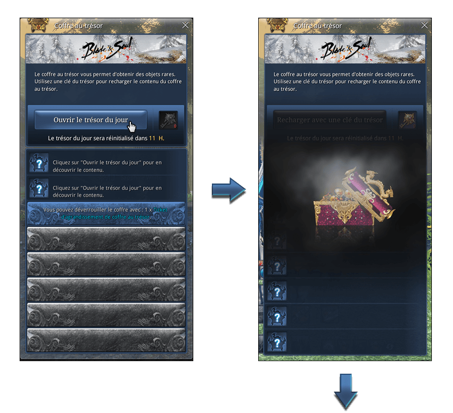 Une fois par jour, chacun de vos personnages de niveau 36 minimim peut ouvrir le Coffre au trésor ! Vous ne pouvez acheter qu'un seul objet du Coffre à l'aide de monnaie virtuelle.