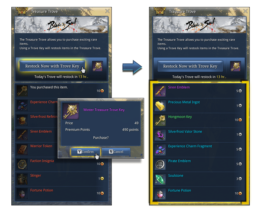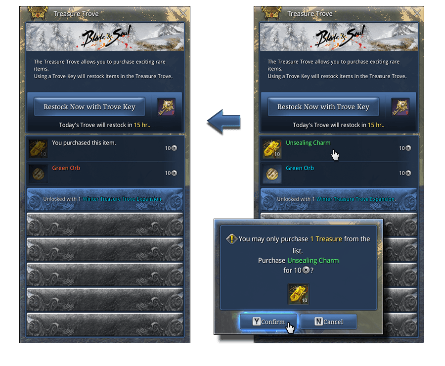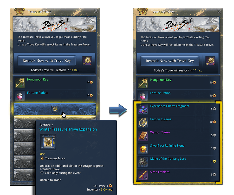 Once a day, the Treasure Trove can be opened for each of your characters level 36 and above! You can purchase only one item from the Trove using in-game currency.